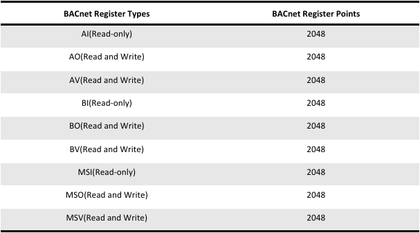 The BACnet gateway supports a BACnet IP server, which supports the following register types and maximum number of points as shown in the table.