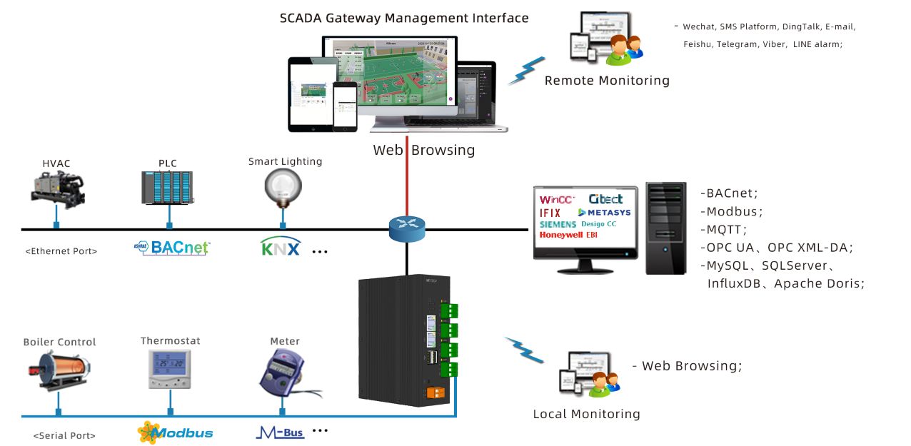 Web Scada gateway integrates other Milesgo gateways using OPC UA to achieve unified monitoring on a single screen. It is also tailored for the upgrading and retrofitting of traditional configuration systems, enabling web access to the Scada configuration through a browser.