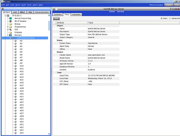 从控制器上可以获取温度、湿度、A厢电压、B厢电压、电流等模拟数据,从而在江森Metasys系统中进行远程控制室内温度,也可以通过网关获取空调开关机状态、制冷制热模式,然后在Metasys系统中进行远程遥控等。迅饶X2BACnet网关内置Emerson精密空调控制器监控协议(定制开发接口),从前端采集控制器上的数据,然后转成BACnet从站,通过BACnetIP协议接入到江森自控系统,使得Emerson的控制器设备能够很容易的集成到江森楼宇自控系统中。